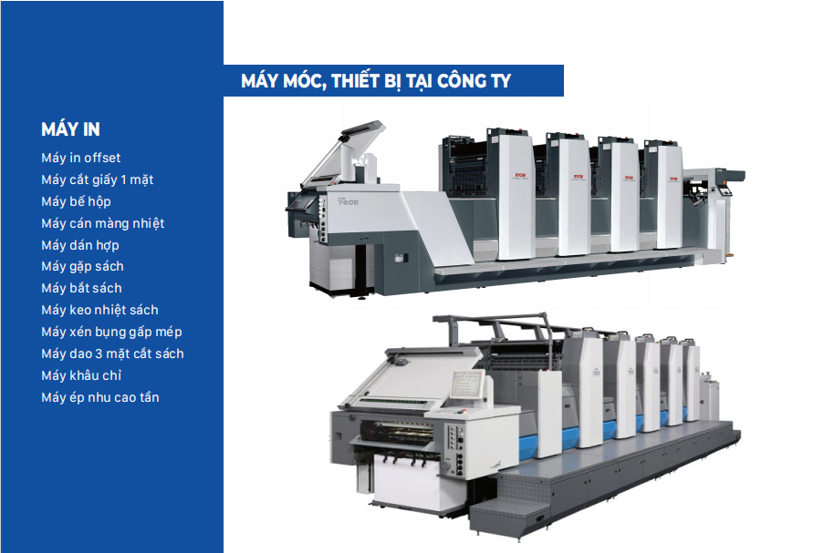 Công ty chúng tôi liên tục tăng trưởng với tốc độ cao, nguồn tài chính vững mạnh, đảm bảo cho đầu tư và phát triển. Hiện nay Công ty quy tụ nhiều nhân viên kỹ thuật in, cửnhân đã tốt nghiệp từ các trường đại học trong và ngoài nước. Từ cơ sở đó chúng tôi đã mở rộng thêm máy móc, trang thiết bị thêm ( máy in offset màu DAIYA made in Japan) và hệ thống gia công tự động nhằm đáp ứng nhu cầu ngày càng cao của khách hàng và mang đến cho khách hàng những ấn phẩm in với chất lượng tốt nhất.