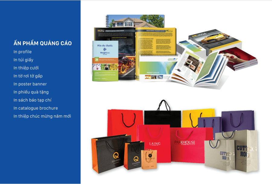 - In nhanh và các dịch vụ liên quan đến in như: Sách, Tạp chí In tờ rơi, lịch tết, name card, đồng phục…